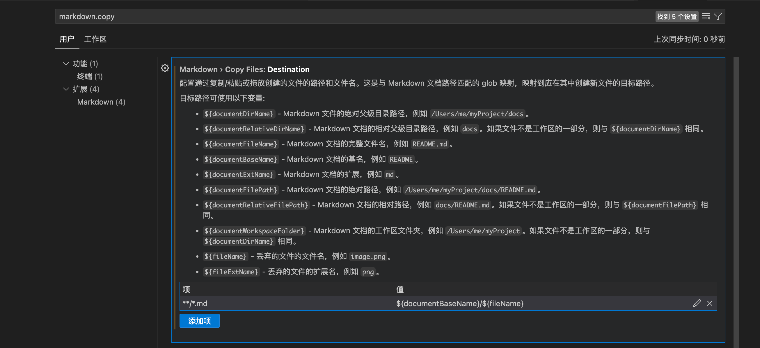 markdown.copy, 找到Markdown> Copy Files:Destination - 新增配置项 key 为 “
